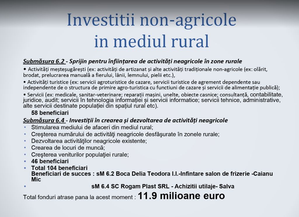 Pentru alte afaceri la țară decât cele agricole s-au dat 11,9 milioane de euro.