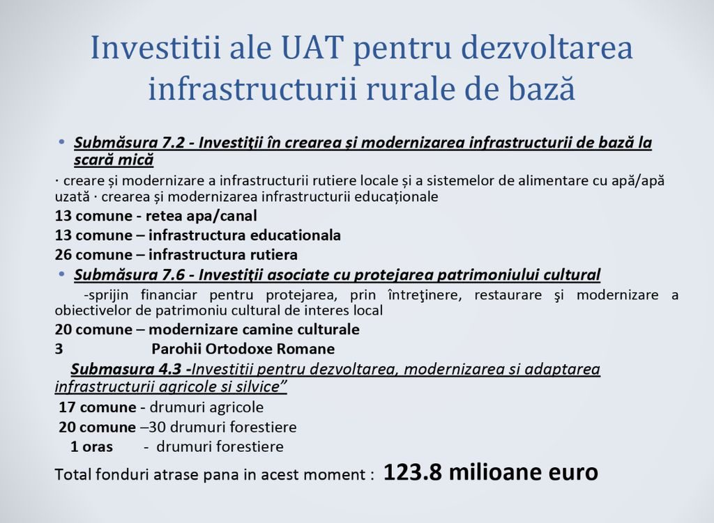 Primăriile din județ au accesat la rândul lor 123,8 milioane de euro în rețele de apă și canal, școli, drumuri și cămine culturale. Trei parohii ortodoxe au luat bani europeni pentru lucrări la biserici.