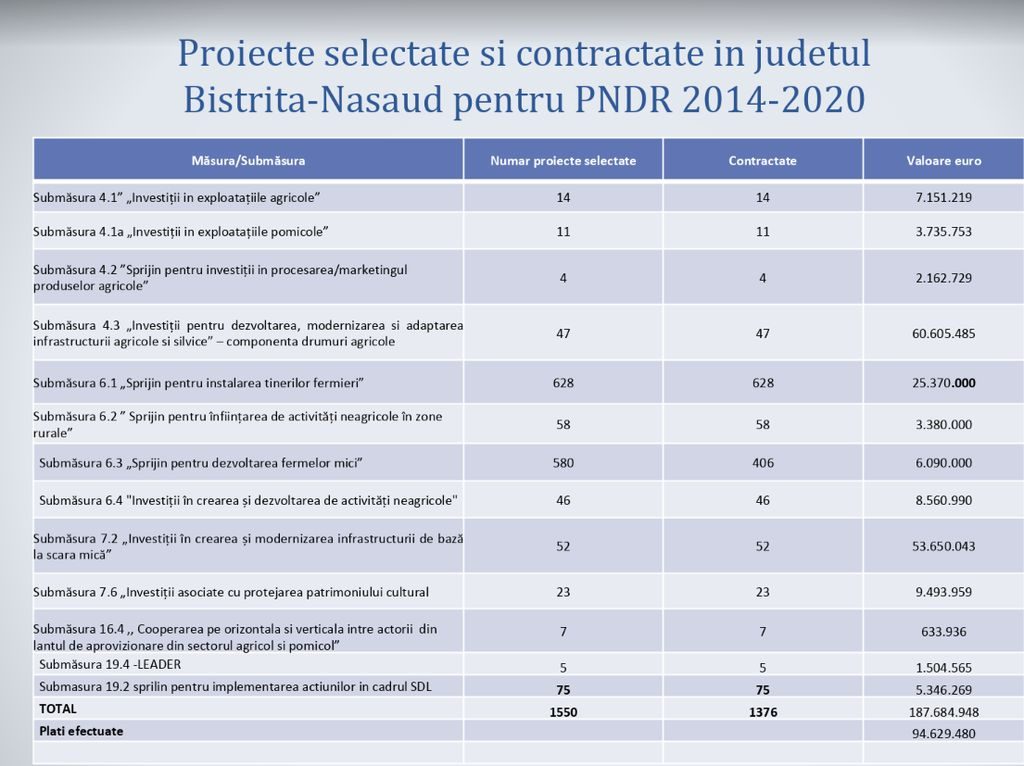 Peste 1500 de proiecte din Bistrița-Năsăud au fost selectate de Agenția pentru Finanțarea Investițiilor Rurale (AFIR) pentru a primi finanțare prin Programul Național de Dezvoltare Rurală (PNDR) 2014-2020 din care 1376 au fost deja contractate, suma intrată în conturile beneficiarilor fiind de circa 95 de mil. de euro din totalul de circa 188 de mil. de euro.