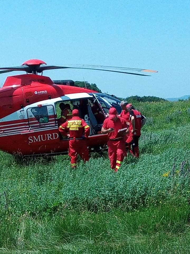 (FOTO) Un elicopter SMURD a fost chemat miercuri, la prânz, să transporte la Târgu Mureș, la o clinică de specialitate, un bărbat de circa 50 de ani care a căzut din cireș în timp ce încerca să culeagă fructe.