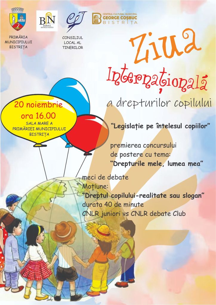 Bistrița marchează Ziua Internațională a Drepturilor Copilului. Joi 20 noiembrie, de la ora 16.00, în sala de ședințe a Primăriei are loc un eveniment special dedicat copiilor și tinerilor.