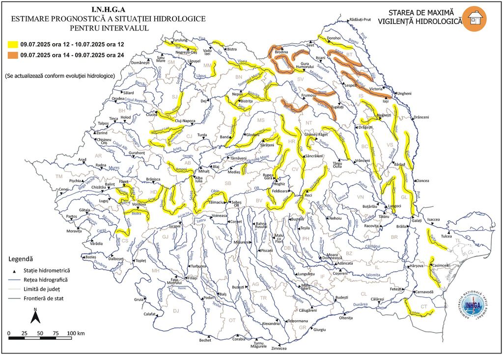 Hidrologii au emis cod galben pe râurile din bazinul hidrografic Someșul Mare – bazin superior și afluenți bazinul mijlociu și inferior, de vineri 27 iunie ora 12.00 până sâmbătă 28 iunie ora 12.00.