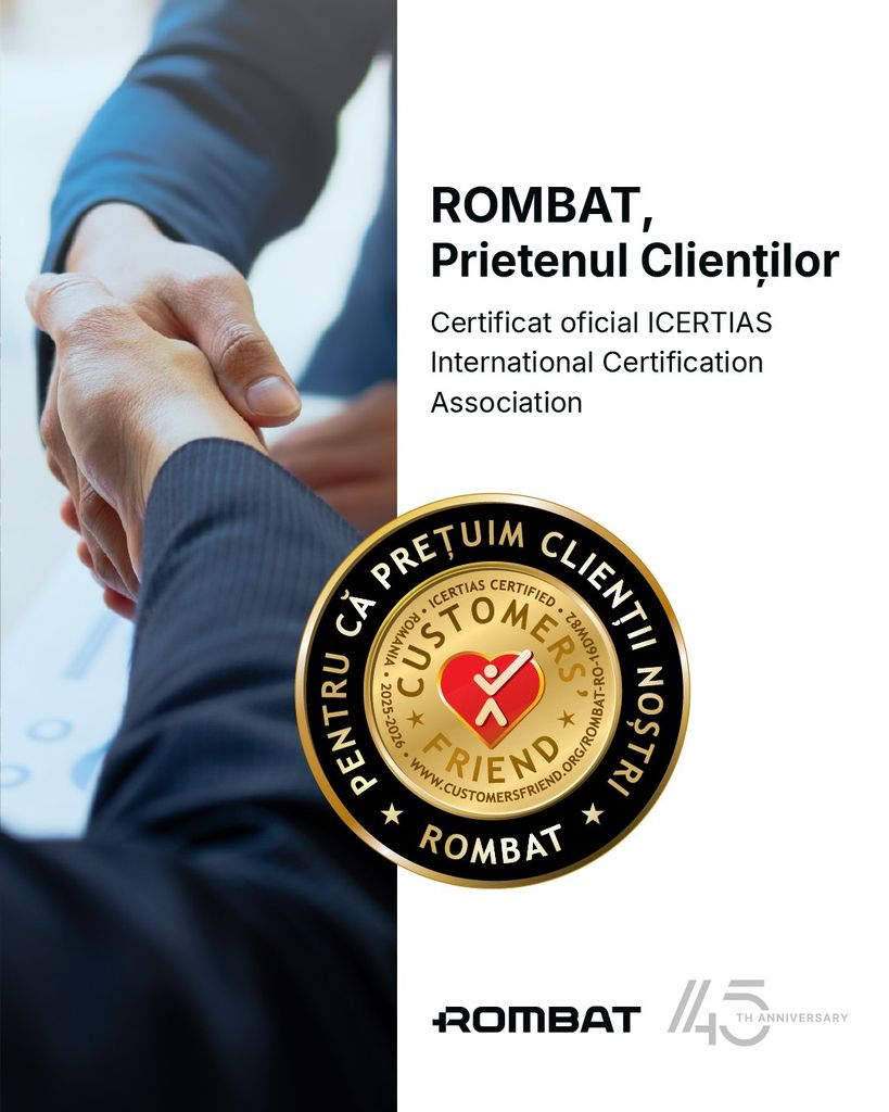 Programul ”Customers’ Friend” este dedicat companiilor care adoptă o abordare etică, responsabilă și umană în desfășurarea activității. Obținerea acestei certificări demonstrează că ROMBAT este perceput ca un partener de încredere, care pune pe primul loc respectul, integritatea și calitatea în toate interacțiunile sale. Certificarea a fost acordată în urma unor sondaje independente desfășurate de ICERTIAS în rândul consumatorilor, care au evaluat experiența directă cu brandurile din diverse domenii de activitate. Rezultatele au evidențiat reputația solidă a ROMBAT și nivelul ridicat de satisfacție generat de interacțiunile cu compania noastră.