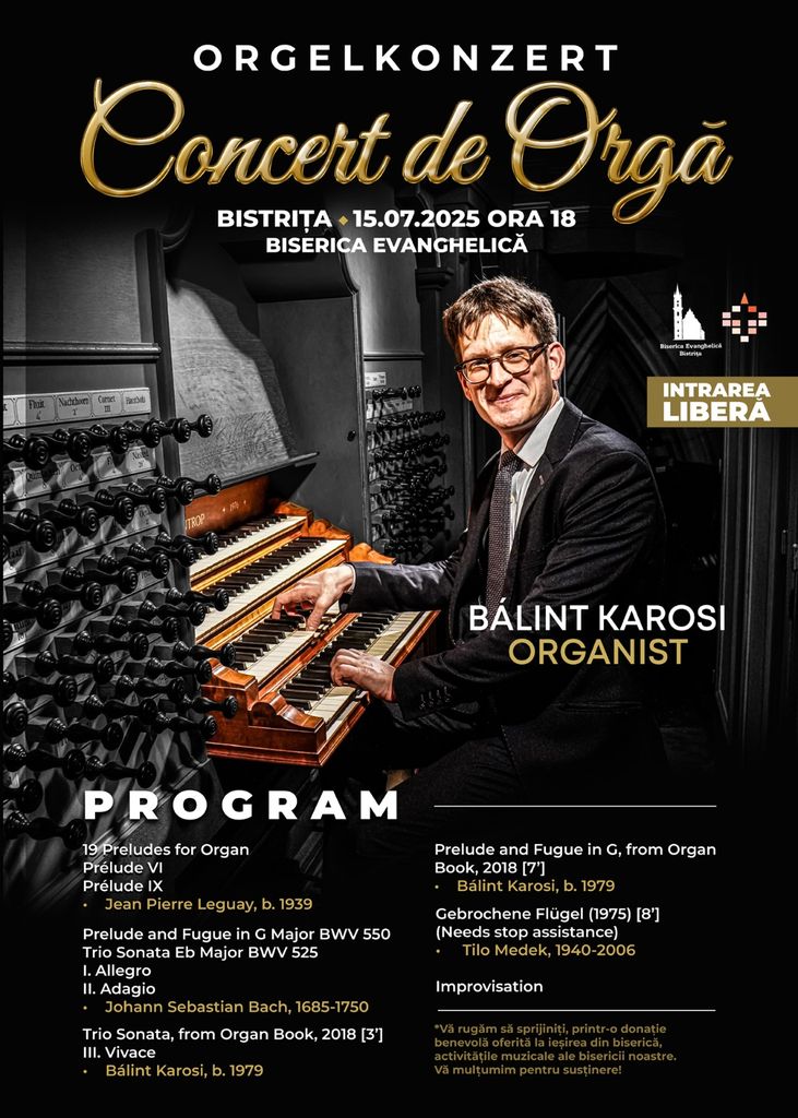 O seară muzicală deosebită: renumitul organist Balint Karosi va concerta în Biserica Evanghelică din Bistrița marți 15 iulie, de la ora 18.00.