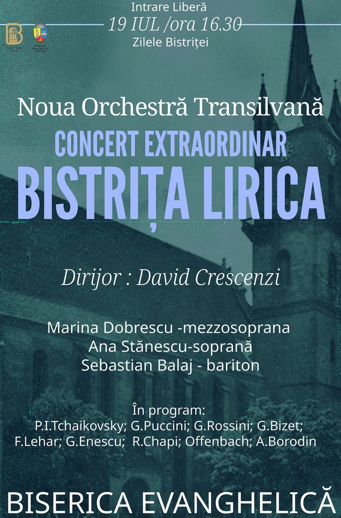 De Zilele Bistriței (18-20 iulie), în Biserica Evanghelică este programat un concert extraordinar ”Bistrița Lirica” susținut de Noua Orchestră Transilvană, dirijor David Crescenzi.