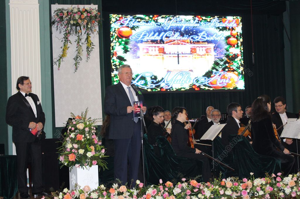 ”La mulți ani! Să aveți un an 2018 frumos, fericit, să fiți sănătoși și să vă bucurați de viață. A trecut perioada colindelor, a Târgului de Crăciun, a Plugușorului, a trecut și părintele cu Iordanul și închidem ciclul sărbătorilor de iarnă cu un concert de Bobotează spunem noi pentru că nu vrem să rivalizăm cu cel de la Viena, deși ziceam anii trecuți că suntem mai înalți decât ei, Bistrița este undeva la 358 de metri altitudine iar Viena un pic mai jos. Palatul Culturii ne primește într-o atmosferă absolut incredibilă, cu flori minunate ca în sala Operei de la Viena. 2018 este un an special, este anul Centenarului Marii Uniri. Porțiuni din România Mare sunt în afara granițelor, dar ne dorim ca într-un viitor nu foarte îndepărtat să vină înapoi. Nu știm când, dar noi cei care suntem în această Românie avem datoria să răspundem în mod corespunzător chemării prezentului, pentru a ne arăta urmași demni ai celor care acum 100 de ani au făcut Marea Unire. Avem marea șansă de a face România o țară frumoasă și prosperă, folosindu-ne de integrarea europeană și nu numai. Toate manifestările culturale din acest an vor fi dedicate acestui mare eveniment, Centenarului. Anii trecuți n-au fost ușori, nici în viitor n-o să ne aștepte ani ușori dar să-i mulțumim Celui de Sus că am fost feriți de cutremure, inundații sau incendii aici la Bistrița, un tărâm frumos și binecuvântat. Să trăim în armonie în anii care vin!”, a urat publicului primarul Ovidiu Crețu.