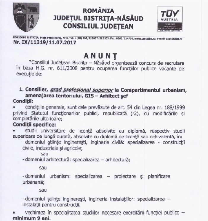 ANUNȚ Consiliul Județean Bistrița-Năsăud organizează concurs de recrutare pentru ocuparea următoarelor funcții publice vacante de execuție: Consilier, grad profesional superior, Consilier, grad profesional asistent și Consilier, grad profesional principal la Compartimentul urbanism, amenajarea teritoriului, GIS – Arhitect şef.