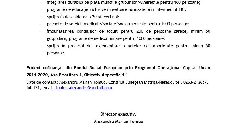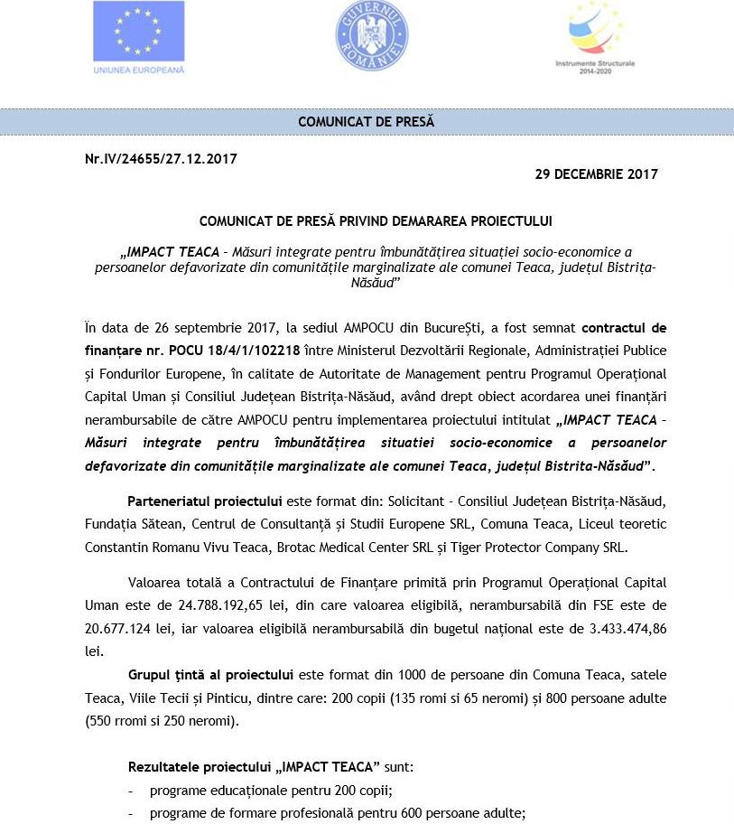 COMUNICAT DE PRESĂ privind demararea proiectului ”Impact Teaca – Măsuri integrate pentru îmbunătățirea situației socio-economice a persoanelor defavorizate din comunitățile marginalizate ale comunei Teaca, județul Bistrița-Năsăud”