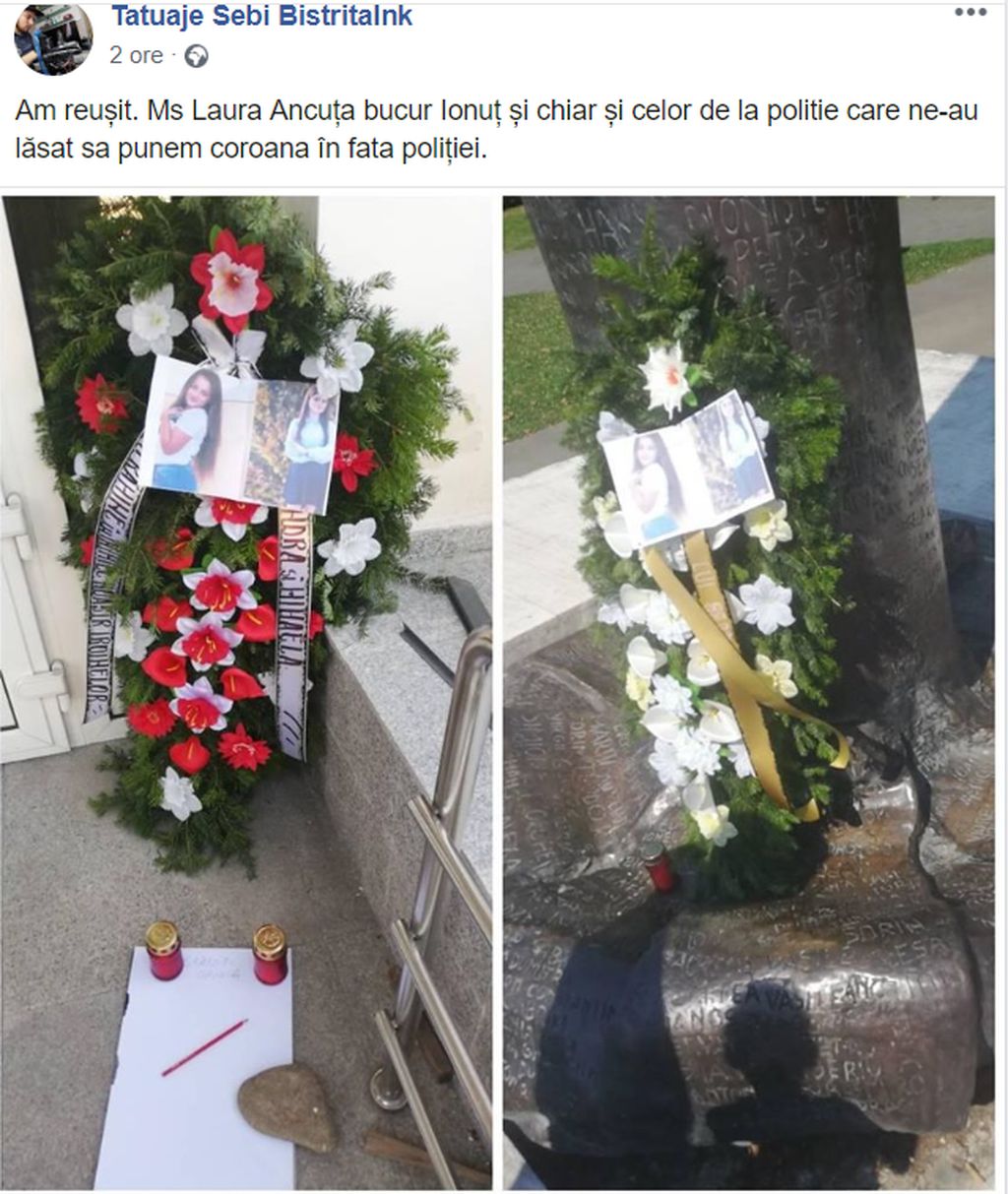 Câțiva bistrițeni au depus o coroană de flori la sediul Inspectoratului de Poliție Județean și o alta în Parcul Eroilor în memoria Alexandrei și a Mihaelei, adolescentele ucise la Caracal de Gheorghe Dincă.