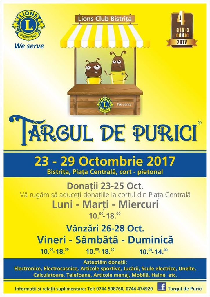 Cel puţin aşa reiese din anunţul Lions Club Bistriţa referitor la Târgul de purici, ediţia 2017. Organizaţia face apel către bistriţeni să doneze electronice, electrocasnice, articole sportive, îmbrăcămine, încălţăminte şi alte bunuri începând cu 23 octombrie la cortul din Piaţa Centrală.