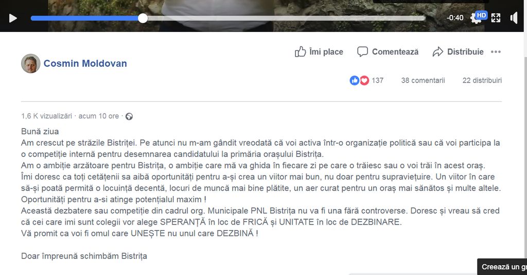 În filmul realizat, parcă predestinat, cu spatele la un zid, cel mai probabil al cetăţii pe care Cosmin vrea să o cucerească acum în mediul virtual, el spune următoarele: “Numele meu este Cosmin Moldovan. M-am născut, crescut şi educat în Bistriţa. Ştiu cum este să te zbaţi în acest oraş. De aceea, în aceste vremuri, avem nevoie să ne susţinem între noi, iar cei care vor conduce destinele noastre trebuie să fie mai deschişi colaborării cu locuitorii municipiului. Pentru ca în viitor să ne bucurăm de un oraş modern trebuie ca toţi cei care locuim aici, femei, bărbaţi, tineri şi bătrâni, să ne implicăm activ în viaţa comunităţii noastre. Avem nevoie de şcoli şi grădiniţe modernizate, construcţia de noi creşe, atragerea de investitori, încurajarea tinerilor antreprenori, crearea de noi locuri de muncă, fluidizarea traficului şi multe altele care oraşul nostru are nevoie. Pentru toate acestea, avem nevoie de un om care va lupta pentru destinele comunităţii în care locuim. Împreună putem schimba Bistriţa!”.