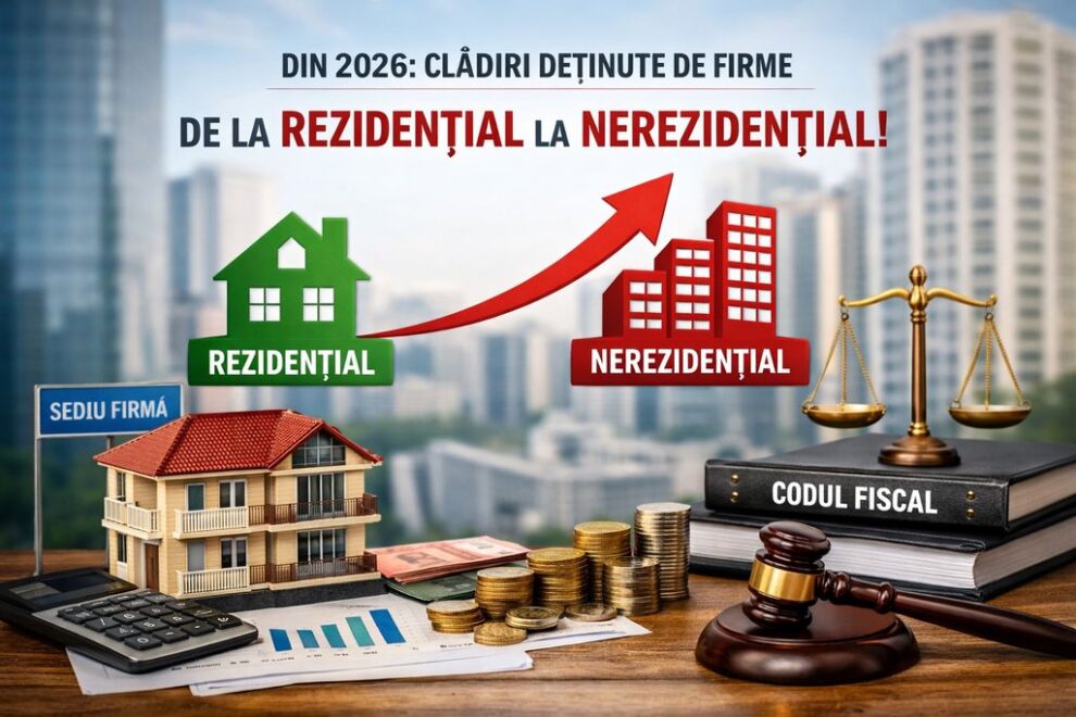 Din 1 ianuarie 2026, clădirile rezidențiale aflate în proprietatea persoanelor juridice (ex. SRL, SA) sunt tratate ca nerezidențiale. Acest lucru înseamnă că un apartament deținut de o firmă nu mai beneficiază de regimul de impozitare pentru locuințe, ci se aplică impozitul pentru clădiri nerezidențiale.