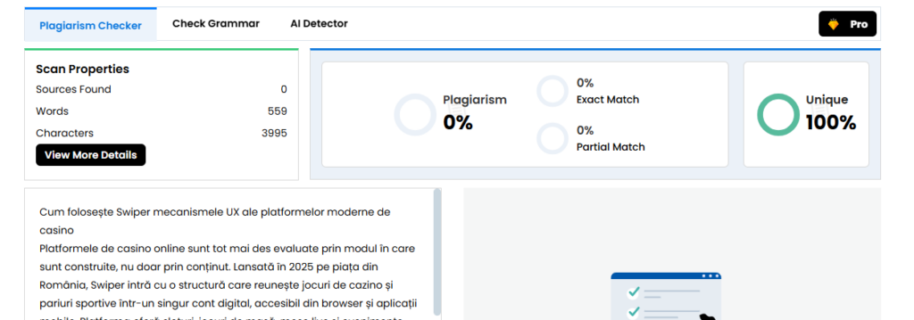 Prin aplicarea unor mecanisme UX împrumutate din platformele digitale moderne, Swiper evidențiază o abordare concentrată pe claritate și funcționalitate. Structura logică, filtrele eficiente și coerența vizuală contribuie la o experiență de casino online adaptată utilizării frecvente. Accentul cade pe organizare și acces rapid, nu pe supraîncărcarea cu elemente inutile.