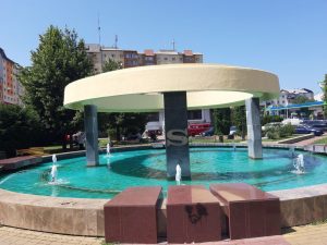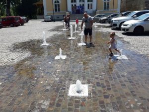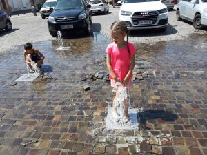 Singura fântână eficientă dintre cele vizitate de noi a fost cea din fața Palatului Culturii. Prin câteva guri de apă îngropate în pavaj țâșneau într-adevăr niște jeturi cât să faci un duș. Mai mulți copii și părinții lor au ales această variantă de răcorire, ștrandul fiind închis.