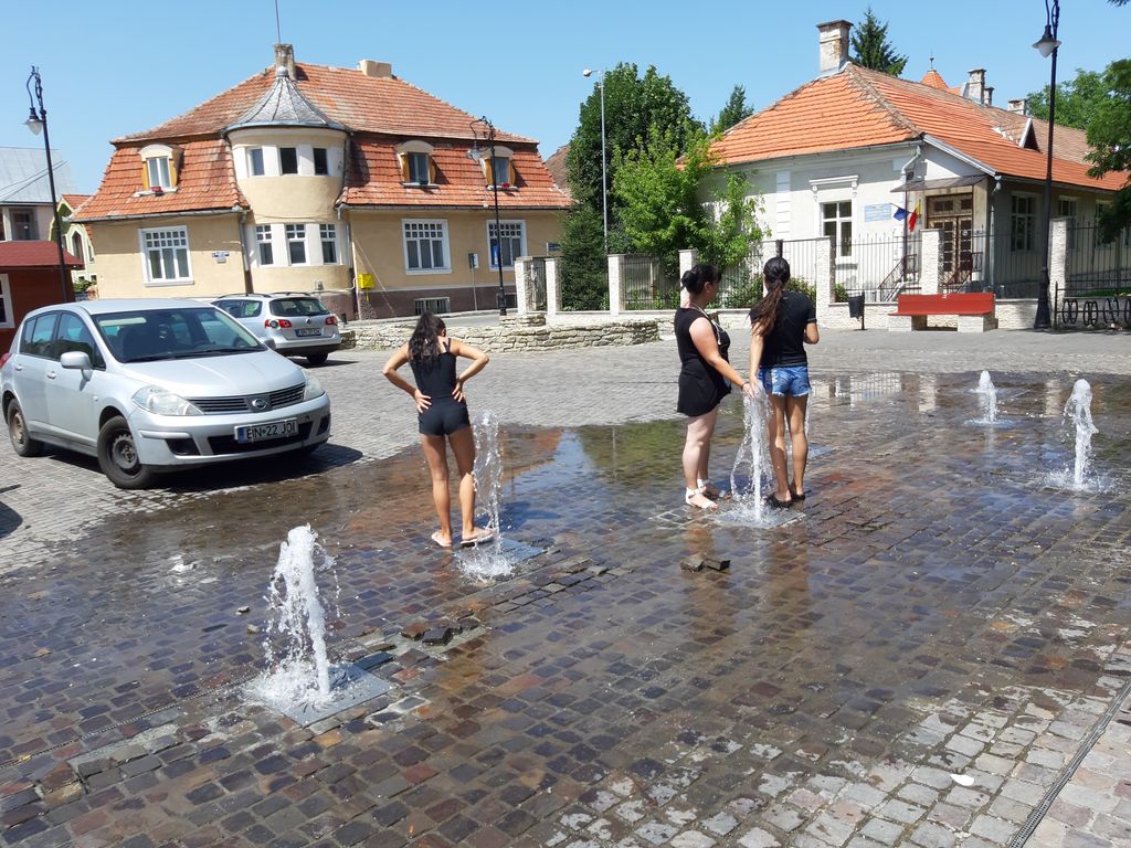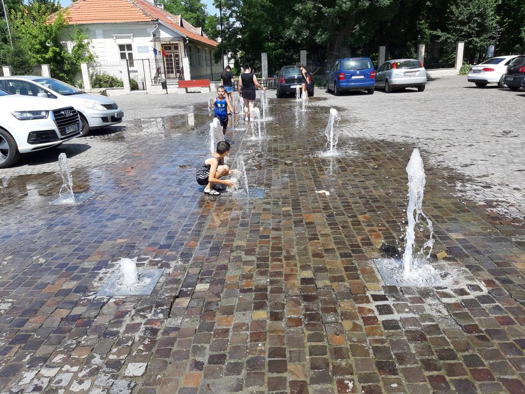 Singura fântână eficientă dintre cele vizitate de noi a fost cea din fața Palatului Culturii. Prin câteva guri de apă îngropate în pavaj țâșneau într-adevăr niște jeturi cât să faci un duș. Mai mulți copii și părinții lor au ales această variantă de răcorire, ștrandul fiind închis.