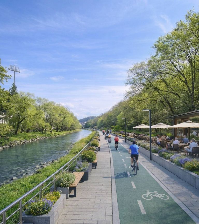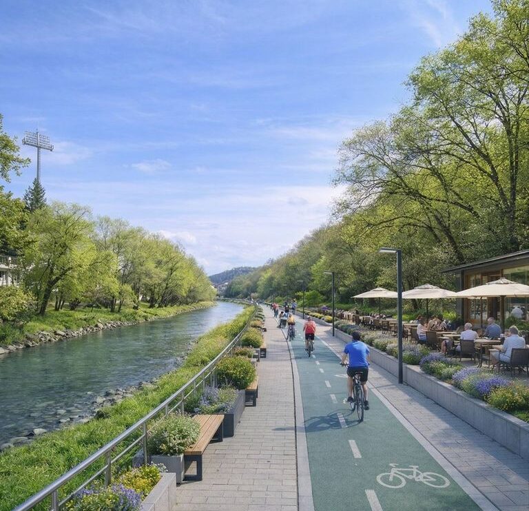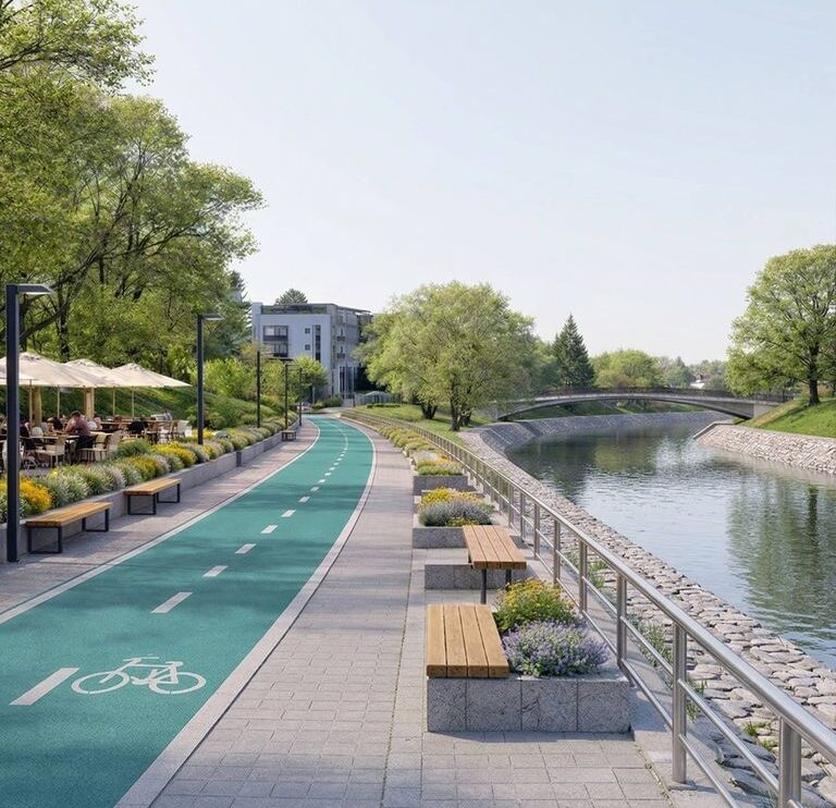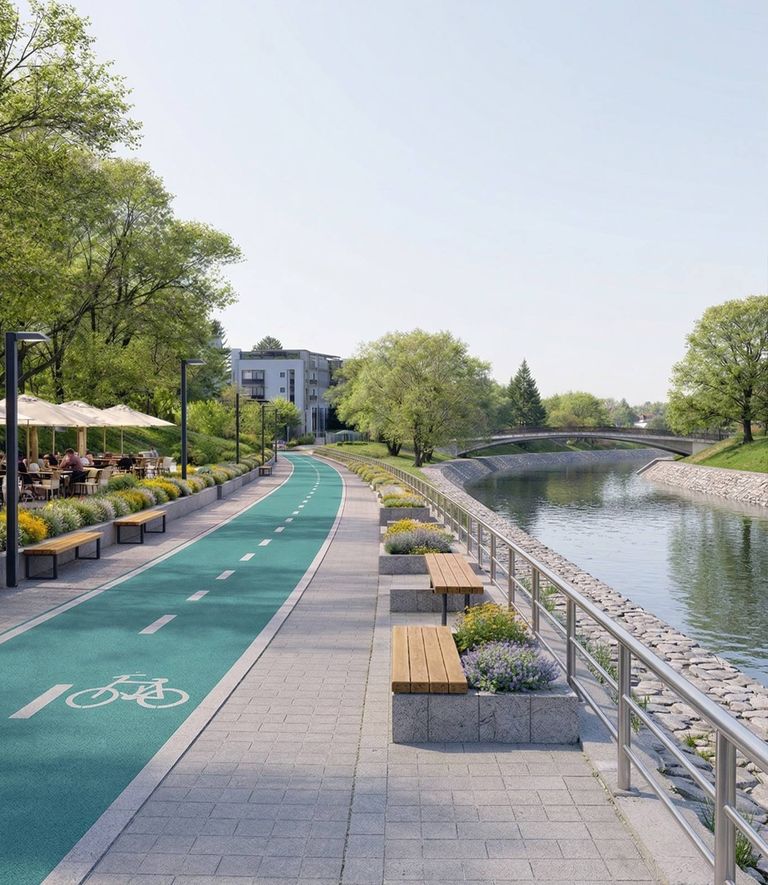 Vorbim despre un coridor de mobilitate de aproximativ 10 kilometri, de-a lungul râului Bistrița, cu piste de biciclete, zone pietonale extinse și spații moderne, gândite pentru oameni. Aproape 2,5 km de piste noi și peste 57.000 mp de promenadă pe malul stâng al râului.