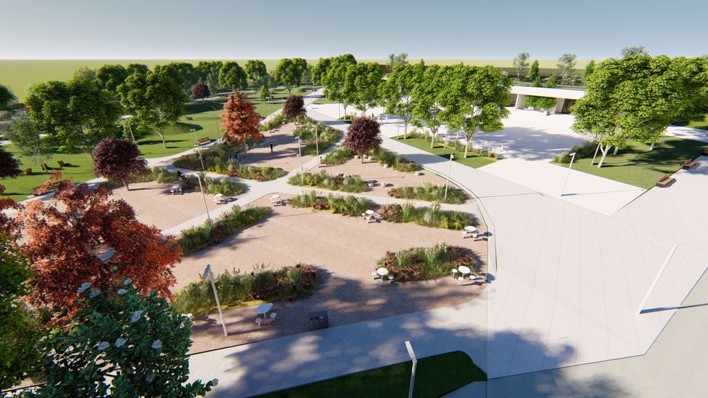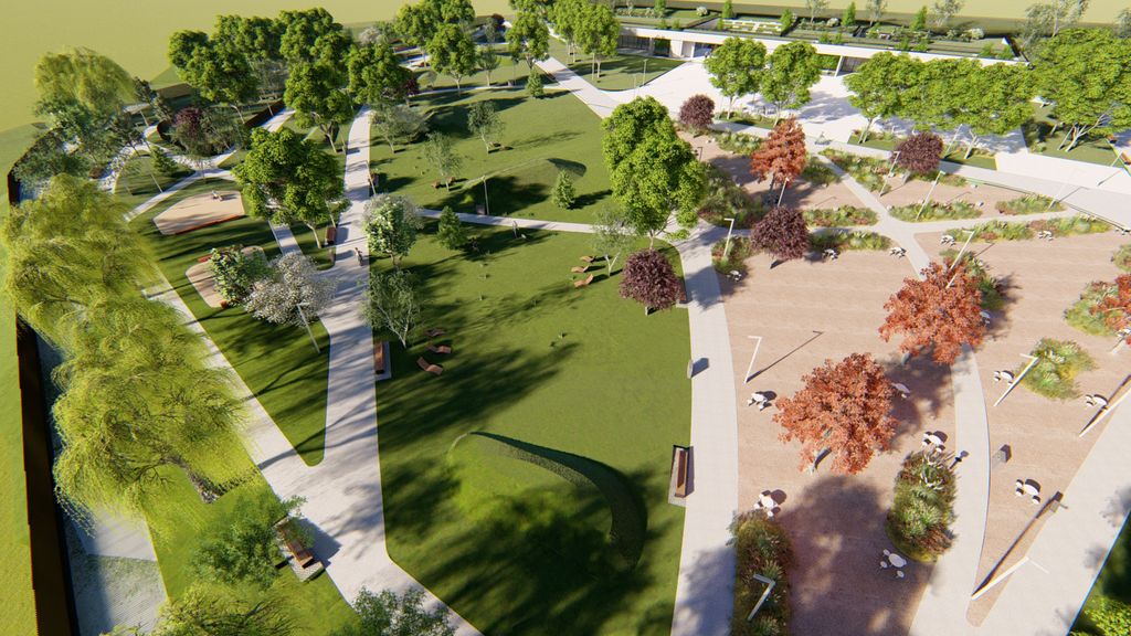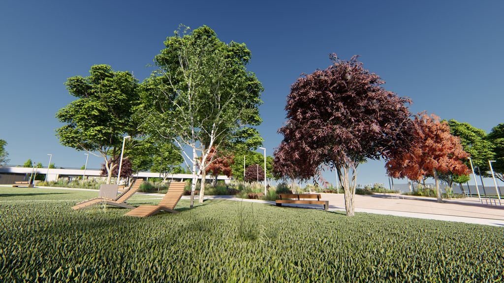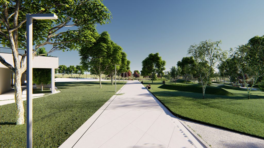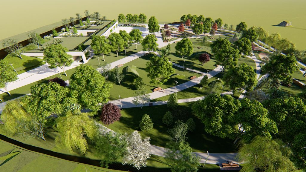 Amenajarea peisageră include movile verzi marcate prin vegetație specifică, zone cu grădini perene, refacerea integrală a gazonului cu rulouri de gazon și sistem de irigație, precum și plantarea unor specii valoroase de arbori precum platan, stejar, carpen, mesteacăn sau cireș japonez.