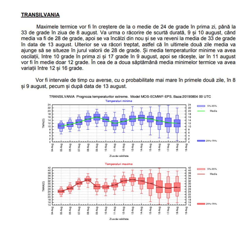 Conform sursei citate, în Transilvania, maximele termice vor fi în creştere de la o medie de 24 de grade în prima zi până la 33 de grade în ziua de 8 august. Va urma o răcorire de scurtă durată, 9 şi 10 august, când media va fi de 28 de grade, apoi se va încălzi din nou şi se va reveni la media de 33 de grade în data de 13 august.