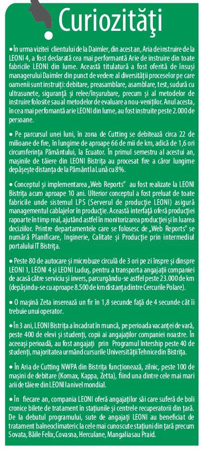 În ziarul intern al companiei Leoni Bistrița, Leoni 360°, apărut la împlinirea a 15 ani de activitate în municipiu și publicat pe pagina oficială de Facebook, sunt prezentate câteva serii de curiozități legate de producția firmei.