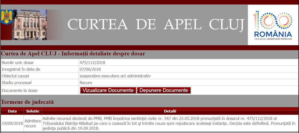 La Curtea de Apel Cluj, Primăria Bistriţa a avut câştig de cauză, sentinţa fiind dată în cursul zilei de miercuri.