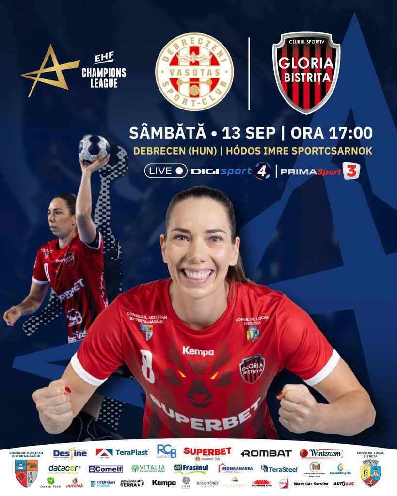 Handbal feminin: Gloria Bistrița joacă în etapa a 2-a din Grupa A a Ligii Campionilor în Ungaria la Debrecen, cu DVSC Schaeffler, sâmbătă 13 septembrie de la ora 17.00. Ca și în campionat, Gloria ocupă locul 2 în clasament după prima rundă.