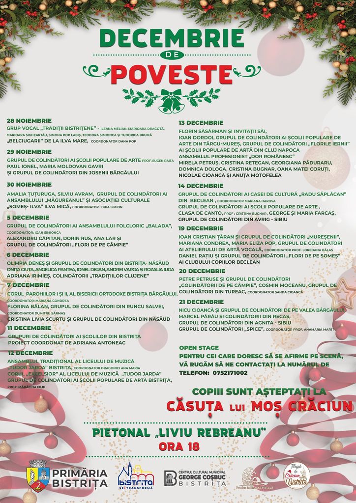 ”Dragi bistrițeni, vă invit cu drag să ne bucurăm împreună de magia sărbătorilor în centrul orașului, unde, începând cu 28 noiembrie, dăm startul unei serii de manifestări artistice dedicate celei mai frumoase perioade din an. ”Decembrie de poveste” începe la Bistrița!” – primarul Gabriel Lazany.