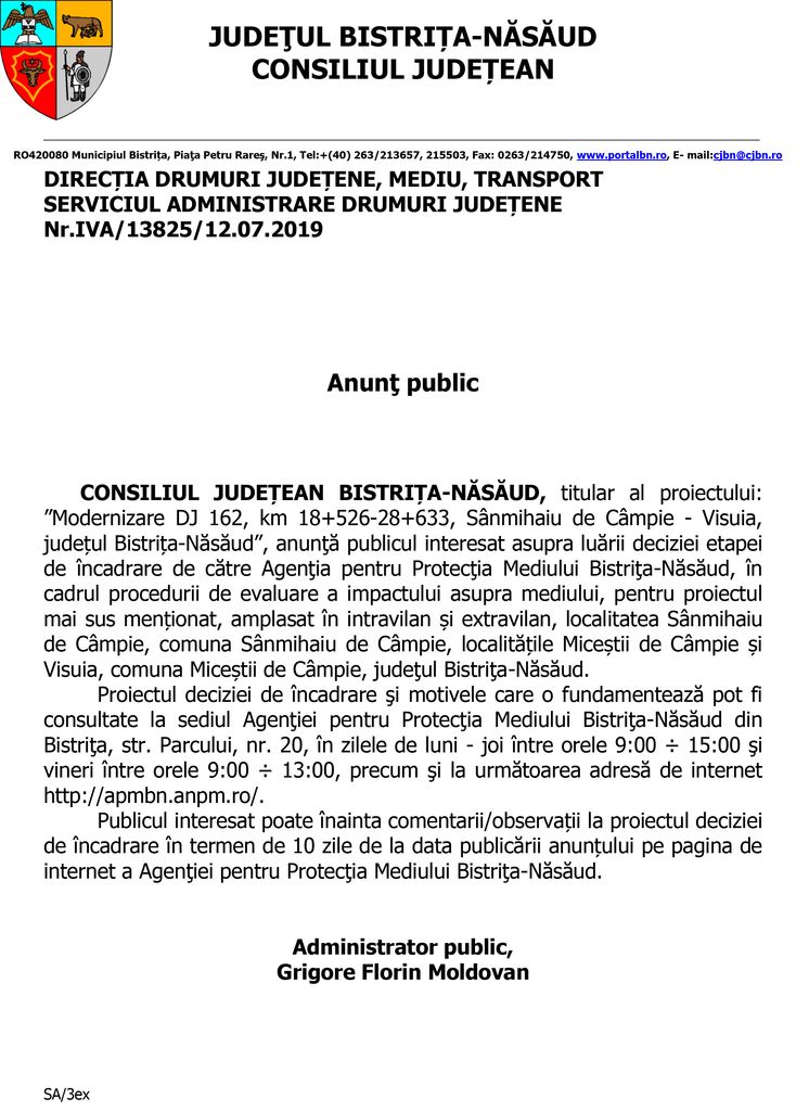 Consiliul Județean Bistrița-Năsăud, titular al proiectului ”Modernizare DJ 162, km 18+526-28+633, Sânmihaiu de Câmpie – Visuia, județul Bistrița-Năsăud”, anunţă publicul interesat asupra luării deciziei etapei de încadrare de către Agenţia pentru Protecţia Mediului, în cadrul procedurii de evaluare a impactului asupra mediului, pentru proiectul menționat.