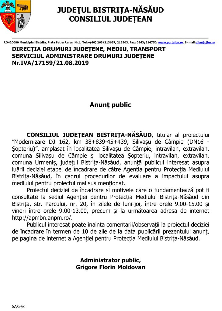 Consiliul Județean Bistrița-Năsăud, titular al proiectului ”Modernizare DJ 162, km 38+839-45+439, Silivașu de Câmpie (DN 16) – Șopteriu”, amplasat în localitatea Silivașu de Câmpie, intravilan, extravilan, comuna Silivașu de Câmpie și localitatea Șopteriu, intravilan, extravilan, comuna Urmeniș, județul Bistrița-Năsăud, anunță publicul interesat asupra luării deciziei etapei de încadrare de către Agenția pentru Protecția Mediului Bistrița-Năsăud, în cadrul procedurilor de evaluare a impactului asupra mediului pentru proiectul menționat.