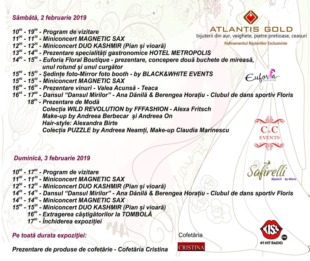41 de expozanți participă la Bistrița Mariage Fest. Noutăți de ultimă oră în domeniul organizării de evenimente festive le sunt propuse vizitatorilor expoziției care vor avea ocazia de a participa la numeroase momente inedite: degustări de cocktail-uri și prezentări de specialități gastronomice oferite de Hotel Metropolis, torturi și prăjituri oferite de cofetăriile „Cristina” și „By Laura”, înghețată de la gelateriile Aniela, Merigo și Betty Ice; prezentare de vinuri – Crama Ascunsă – Via Teaca; ședințe foto Mirror photo booth – Black & White Events și Total Events by Frații Crăciun, demonstrații de dans – Clubul de dans sportiv Floris, miniconcerte Duo Kashmir și Magnetic Sax și prezentarea a două colecții de modă: Colecția „Wild Revolution” by Alexa Fritsch și Colecția „Puzzle” by Andreea Neamți.