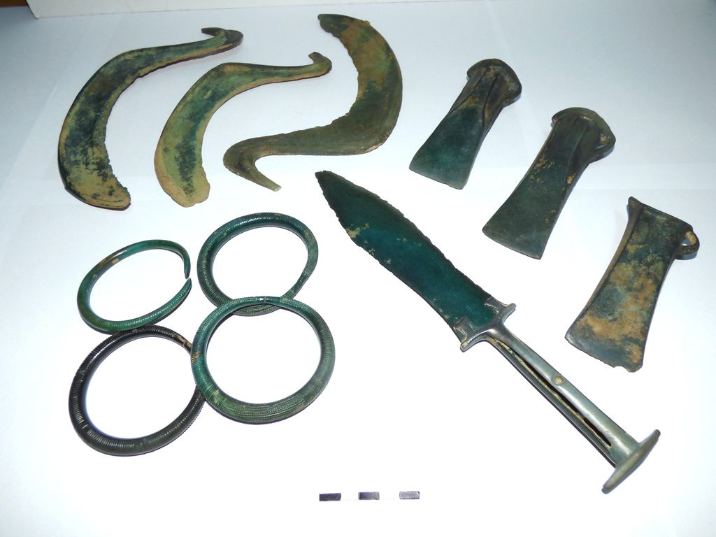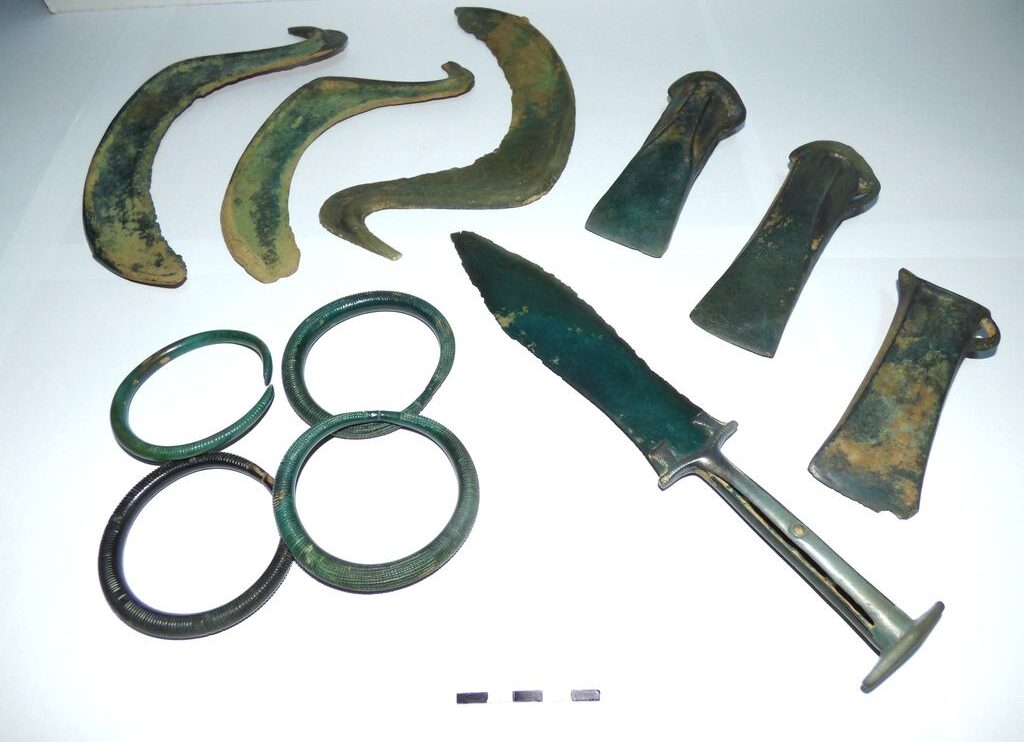 Cercetările arheologice au dus la scoaterea la suprafaţă a unui valoros depozit de piese din bronz, compus din unsprezece obiecte: trei topoare de tip celt, trei seceri, patru brățări și un pumnal. În cadrul depozitului se remarcă prezența exclusivă a unor piese depuse întregi, încadrabile în trei categorii: unelte – ilustrate prin topoare masive celturi, din care două de tip transilvănean și unul cu gura concavă, și prin trei seceri de tipul celor cu cârlig; podoabe – prezente prin patru brățări bogat decorate, dintre care una cu capetele deschise și trei cu capetele subțiate și foarte apropiate; în timp ce în ultima categorie, a armelor, a fost inclus un pumnal cu garda decorată, cu mânerul decupat longitudinal și prins cu nituri.
