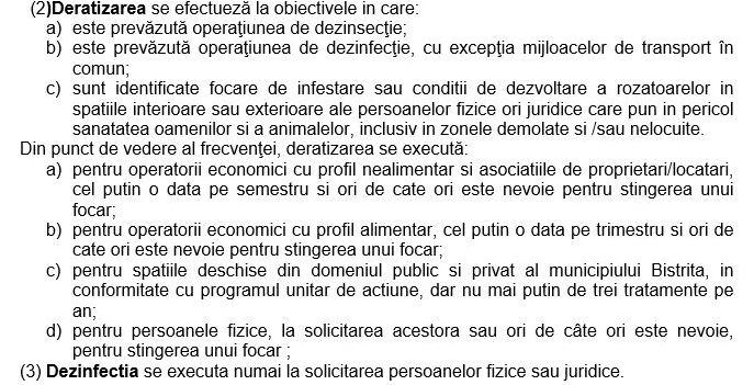 În cadrul Direcţiei funcționează Serviciul Deratizare, dezinsecţie, dezinfecţie care are stabilite atribuţii specifice. ”Pentru aprobarea Regulamentului privind acordarea licenţelor în domeniul serviciilor comunitare de utilităţi publice, pentru ca Direcţia Servicii Publice Bistriţa să poată desfăşura această activitate în calitate de operator de servicii publice autorizat este necesară obţinerea licenţei emise de Autoritatea Națională de Reglementare pentru Serviciile Comunitare de Utilități Publice. Printre documentele care sunt necesare pentru obţinerea licenţei este şi hotărârea de dare în administrare a serviciului sau a unor activităţi ale acestuia, adoptată de Consiliul Local. Totodată, este necesară şi aprobarea Regulamentului serviciului şi Caietului de sarcini pe baza cărora va funcţiona activitatea, precum şi tarifele practicate”, se arată în expunerea de motive.