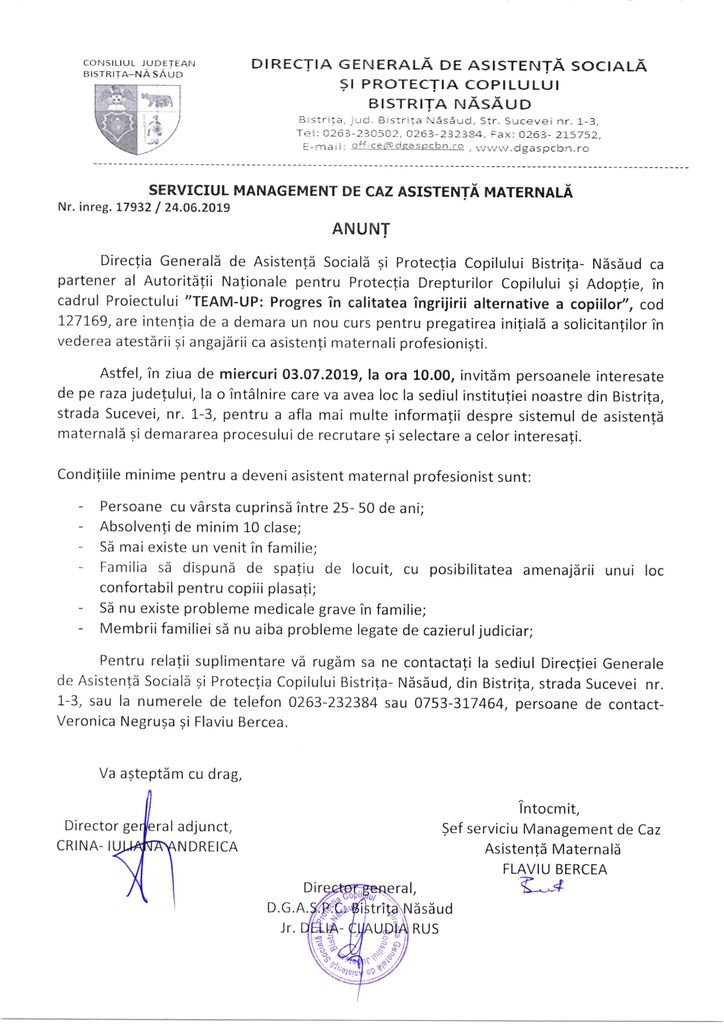 Direcţia Generală de Asistență Socială și Protecția Copilului Bistrița-Năsăud are intenția de a demara un nou curs pentru pregătirea inițială a solicitanților în vederea atestării și angajării ca asistenţi maternali profesioniști.