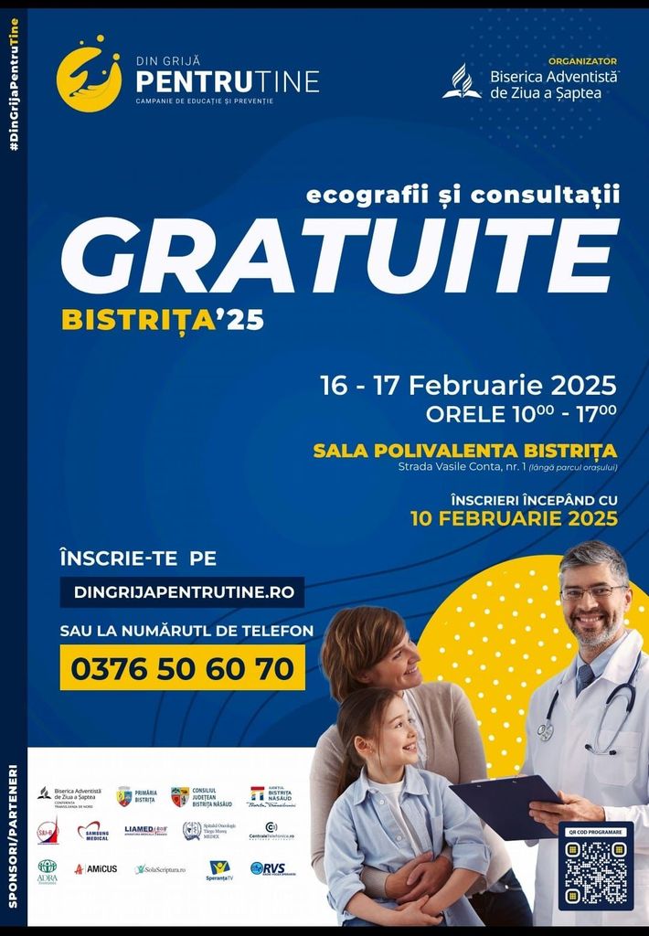 Primăria Bistrița se alătură ca partener campaniei ”Din grijă pentru tine”, un proiect dedicat sănătății comunității. Pe parcursul a două zile, zeci de medici specialiști și asistenți medicali voluntari vor oferi consultații gratuite și ecografii de bază pentru toți cei care doresc să își verifice starea de sănătate.