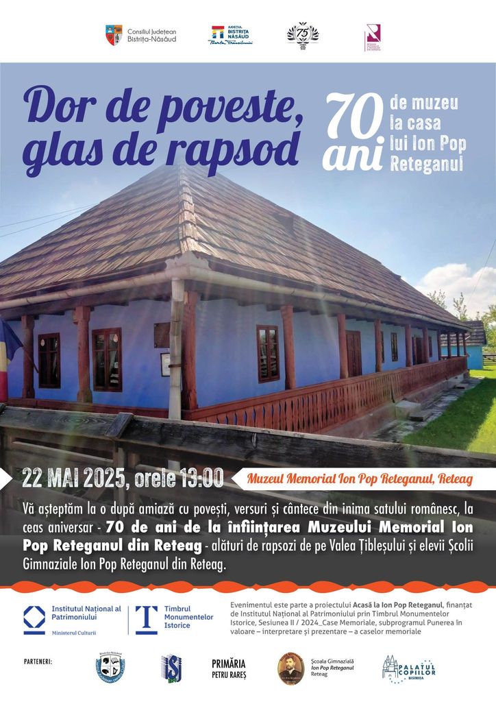 Împlinirea a șapte decenii de la înființarea muzeului memorial ”Ion Pop Reteganul” oferă Complexului Muzeal Bistrița-Năsăud prilejul de organiza evenimentul cultural artistic ”Dor de poveste, glas de rapsod – 70 de ani de muzeu la casa lui Ion Pop Reteganul”.