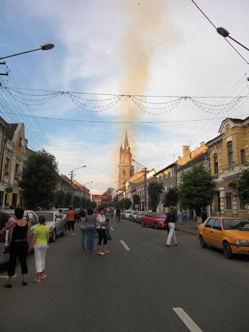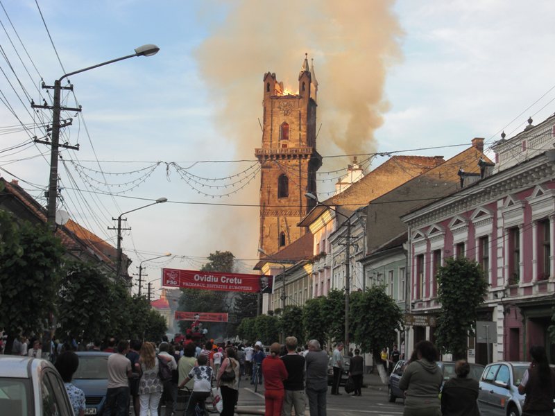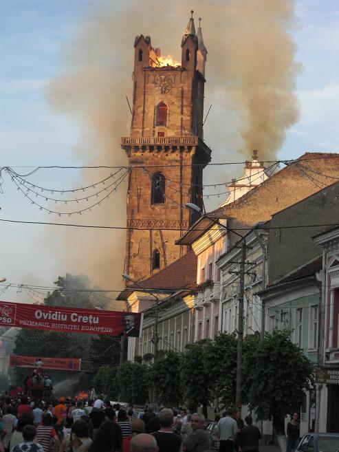 ”Comemorăm 11 ani de la poate cea mai mare tragedie care a zguduit Bistrița în ultimele decenii sau chiar mai mult. Am spus că a ars inima Bistriței, așa am simțit atunci. La două minute după ce focul a fost stins, rezervele de apă ale Bistriței erau epuizate. Dacă asta n-a fost minune, atunci nu știu ce minuni așteptăm. Un bistrițean în vârstă m-a îmbrățișat și plângând m-a întrebat oare unde o să mai învețe oamenii să citească ceasul, pentru că el a învățat să citească ceasul de pe acest turn. Atunci ceasul s-a oprit, inima a încetat să bată. Dacă o inimă încetează să bată, ea trebuie resuscitată, aceasta este procedura medicală. Astăzi, biserica este iarăși întreagă, se lucrează înăuntru, se va mai lucra și afară, dar începutul s-a făcut atunci și a înaintat cu binecuvântarea lui Dumnezeu. Ne-am făcut un obicei să ne strângem aici sub dangătul clopotelor, să ne reculegem și să ne aducem aminte de acele clipe cumplite. La prima întâlnire n-am avut clopote în turn, dar au bătut clopotele tuturor bisericilor din Bistrița, a fost și acesta un simbol pentru enorma solidaritate pe care acel incendiu a aprins-o peste tot. Cu nimic în mâini s-a început această reconstrucție. Mulți au descoperit că nu este numai biserica sașilor, este biserica noastră, a tuturor, este simbolul acestui oraș”, a spus preotul paroh al Bisericii Evanghelice CA Bistrița, Johann Dieter Krauss.