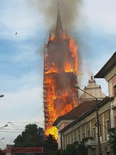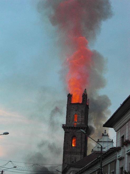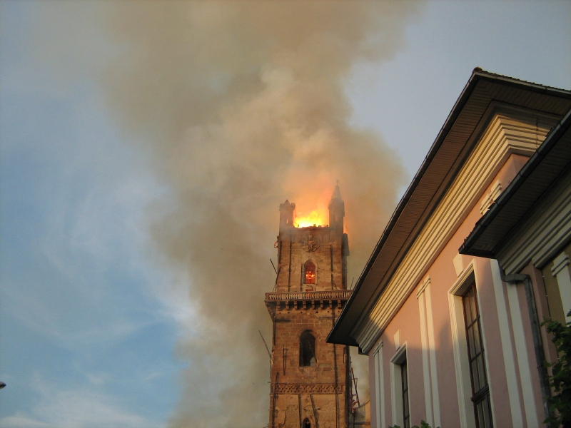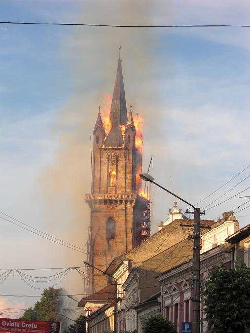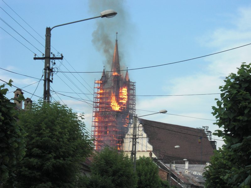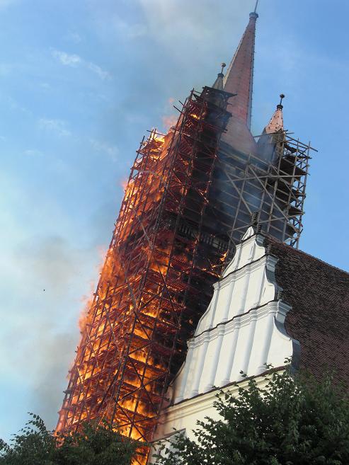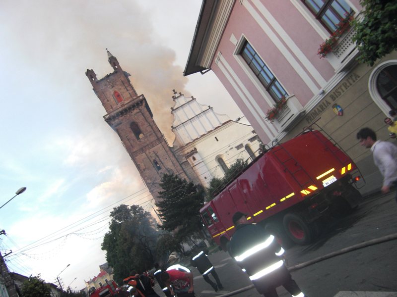 În seara zilei de miercuri, 11 iunie 2008, în jurul orei 19.40, la Biserica Evanghelică din Bistriţa s-a declanşat un incendiu devastator. Acesta a distrus şarpanta şi învelitoarea turnului, acestea prăbuşindu-se, o parte în exteriorul turnului, dar cea mai mare parte în interior, peste bolta ce acoperea ”sala muzeu de la baza turnului”. Au fost distruse şi planşeele din lemn de la nivele intermediare, producându-se şi prăbuşirea clopotelor şi a mecanismelor ceasului. Focul s-a extins şi la şarpanta navei centrale, distrugând o parte a valoroasei şarpante gotice. Pompierii, prezenţi la faţa locului din primele momente ale izbucnirii incendiului, cu mare greutate au reuşit să limiteze distrugerile, în special la şarpanta navei, împiedicând astfel producerea unui dezastru. Focul nu a pătruns în interiorul bisericii, obiectele de cult şi orga aflată în lăcaş rămânând intacte. Incendiul a fost stins după ce zeci de pompieri s-au luptat peste trei ore cu flăcările. După degajarea resturilor din interiorul turnului s-a constatat că cele două clopote s-au topit din cauza temperaturilor ridicate. Pagubele au fost estimate la aproximativ un milion de euro.