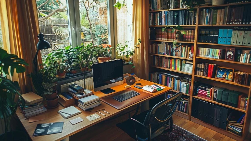 Un birou ordonat, o măsuță decorată sau o bibliotecă aranjată pe culori creează o atmosferă calmă și plăcută. Lumina joacă și ea un rol important – o lampă cu lumină caldă poate transforma complet starea de spirit.