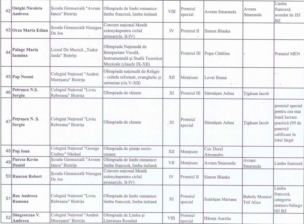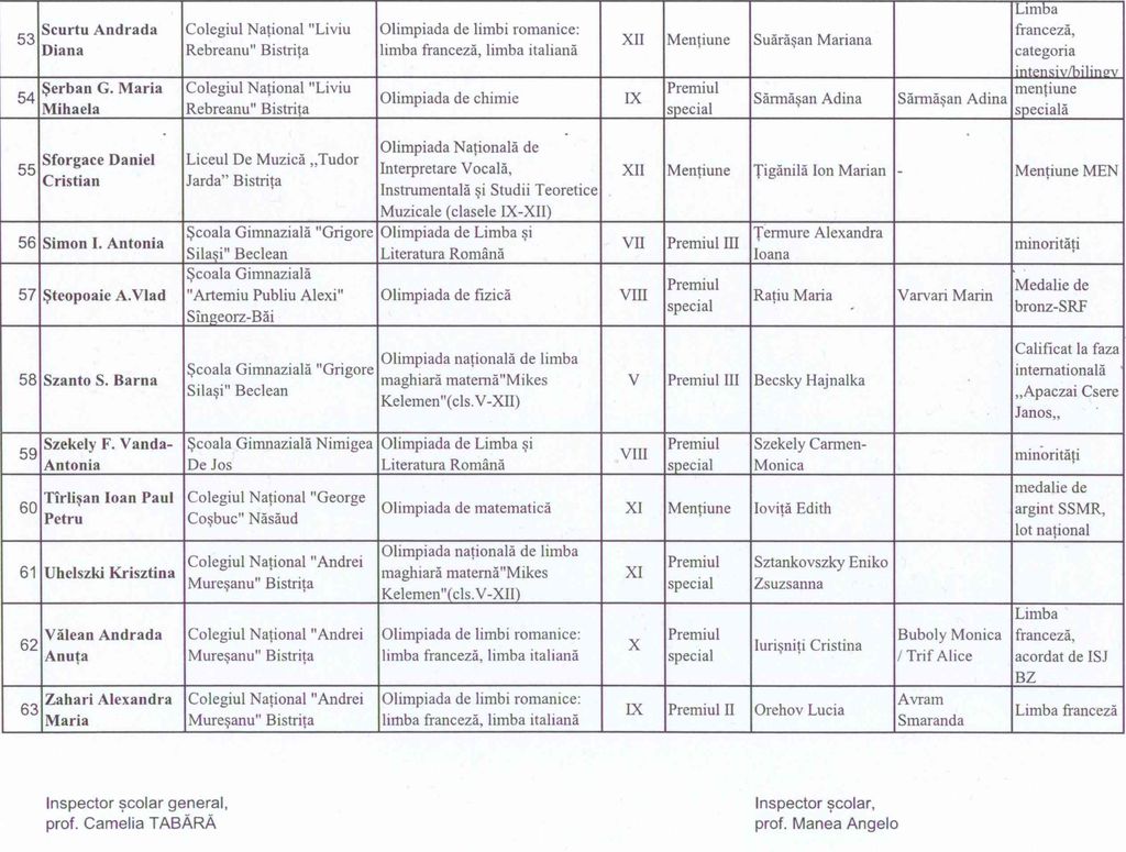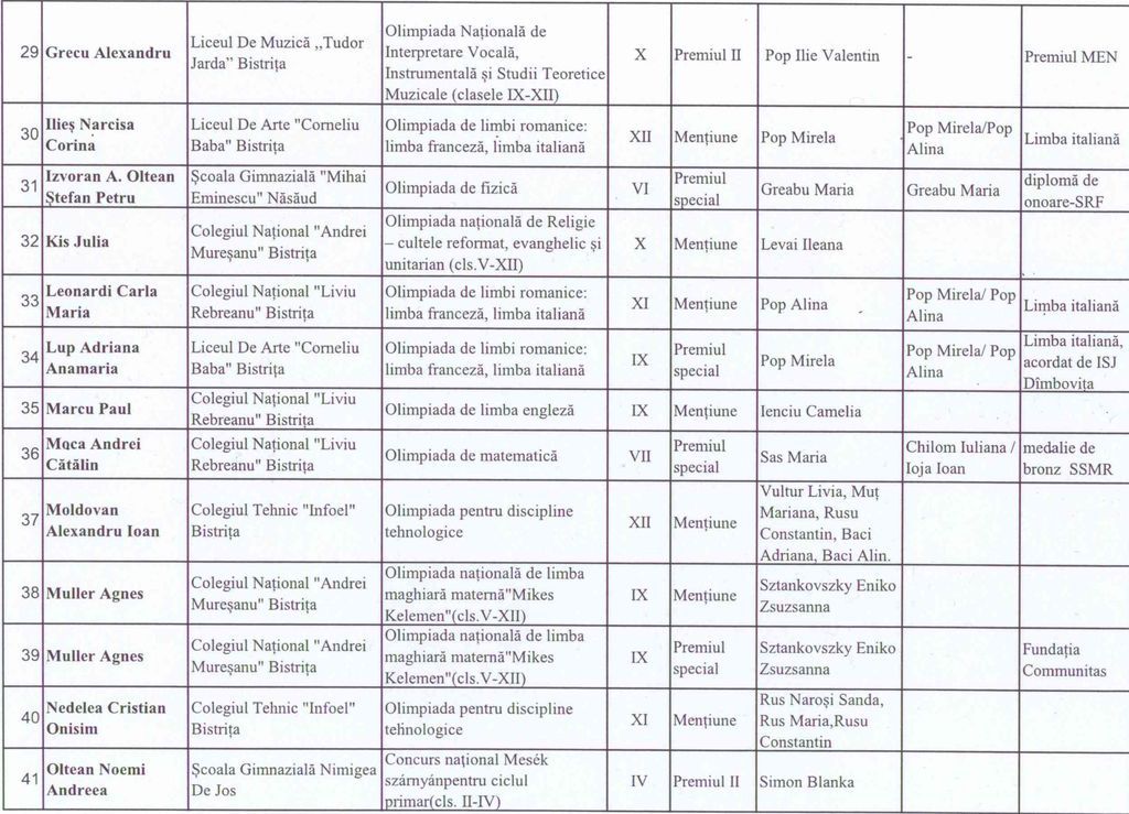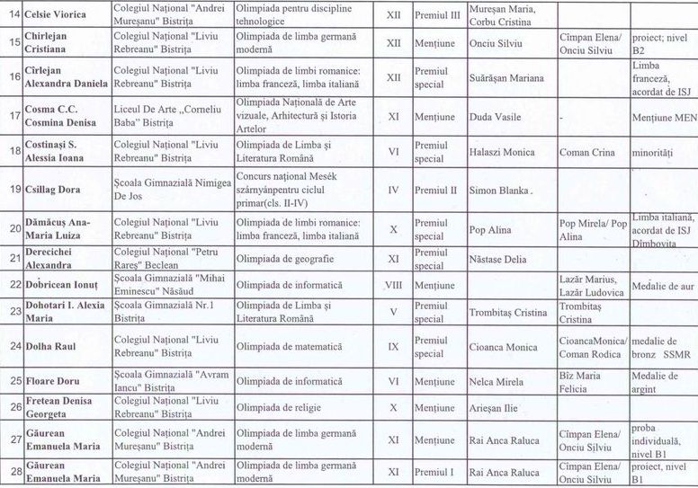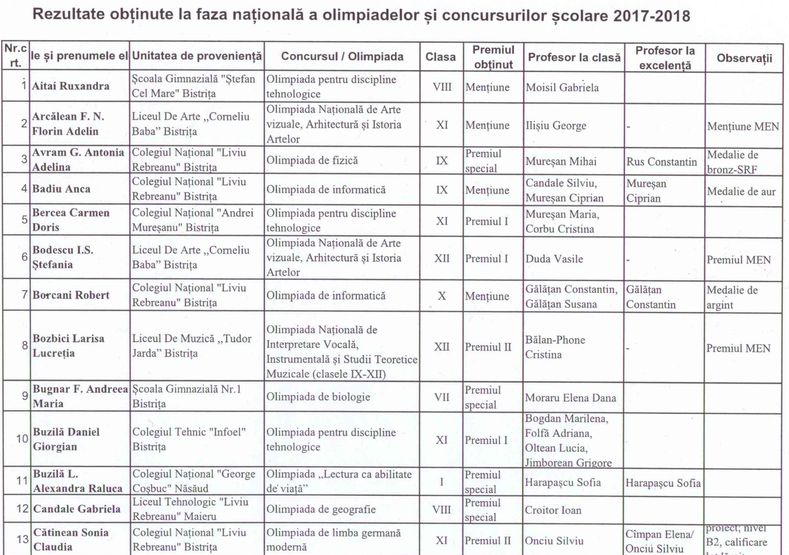 Elevii din Bistriţa-Năsăud au obţinut 62 de premii şi menţiuni la fazele naţionale ale olimpiadelor şi concursurilor şcolare care s-au desfăşurat până în 12 aprilie 2018. Iată lista completă a olimpicilor şi a profesorilor care i-au pregătit: