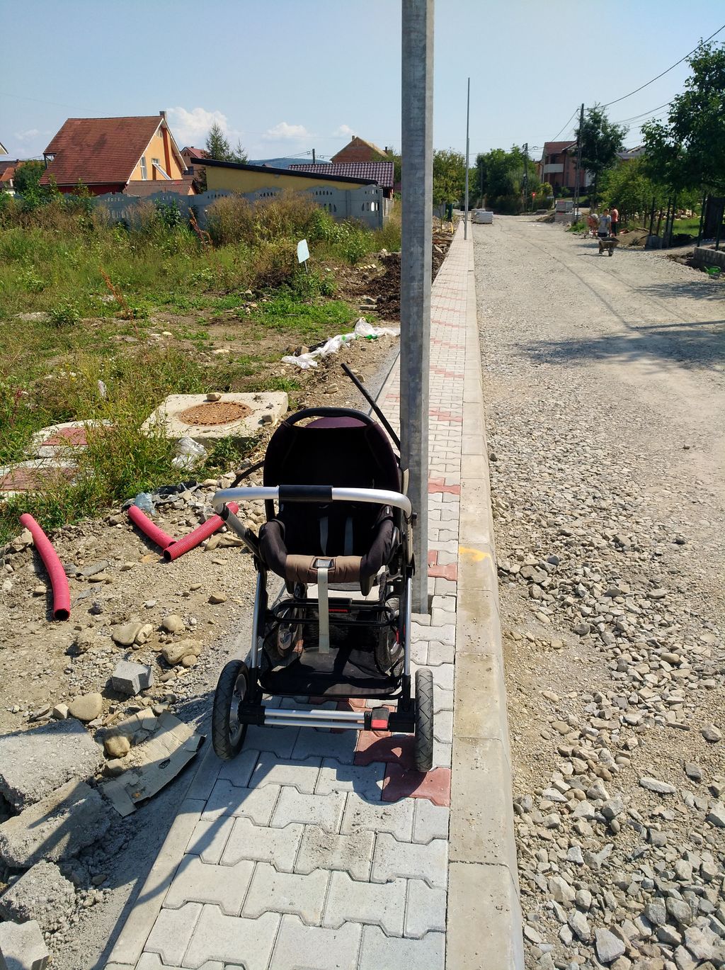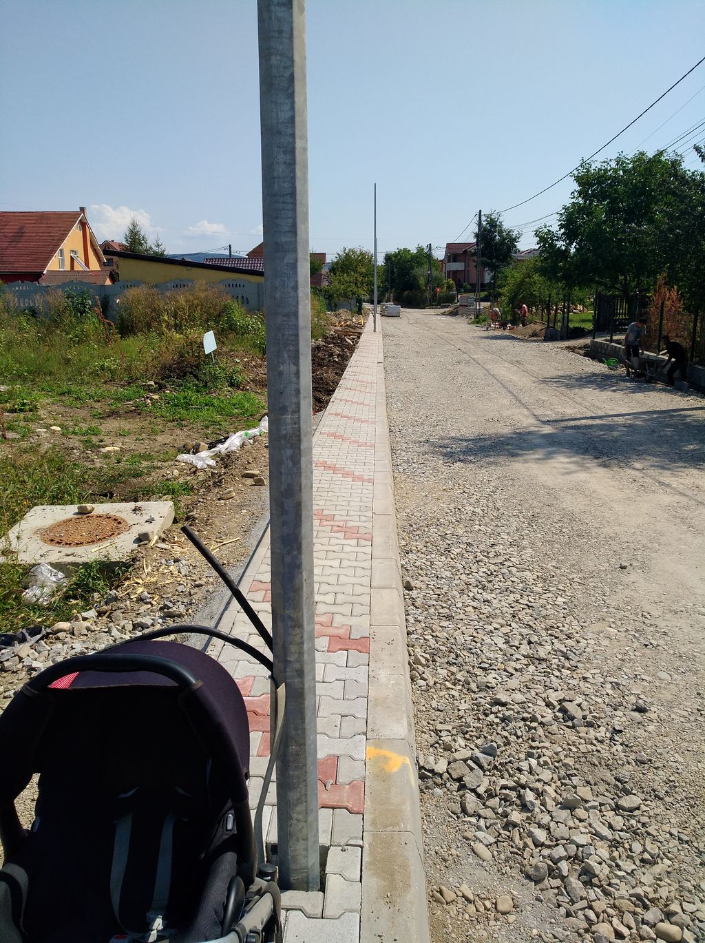 Din imaginea principală reiese că o mamă cu un cărucior nu are cum să meargă pe trotuarul îngust în care au fost implantaţi stâlpi de la noua instalaţie de iluminat stradal. Oamenii efectiv nu înţeleg cum e posibil să nu fi fost montaţi măcar stâlpii la marginea trotuarului sau acesta să fie lărgit pentru că, în felul în care arată acum, este complet inutil.