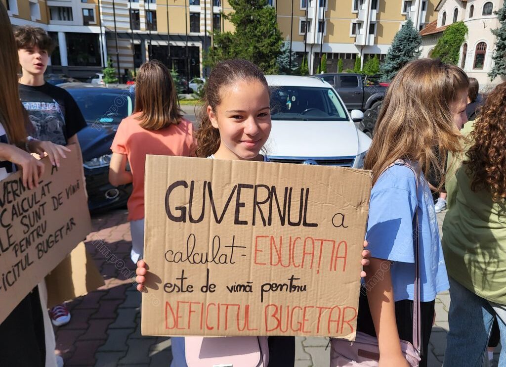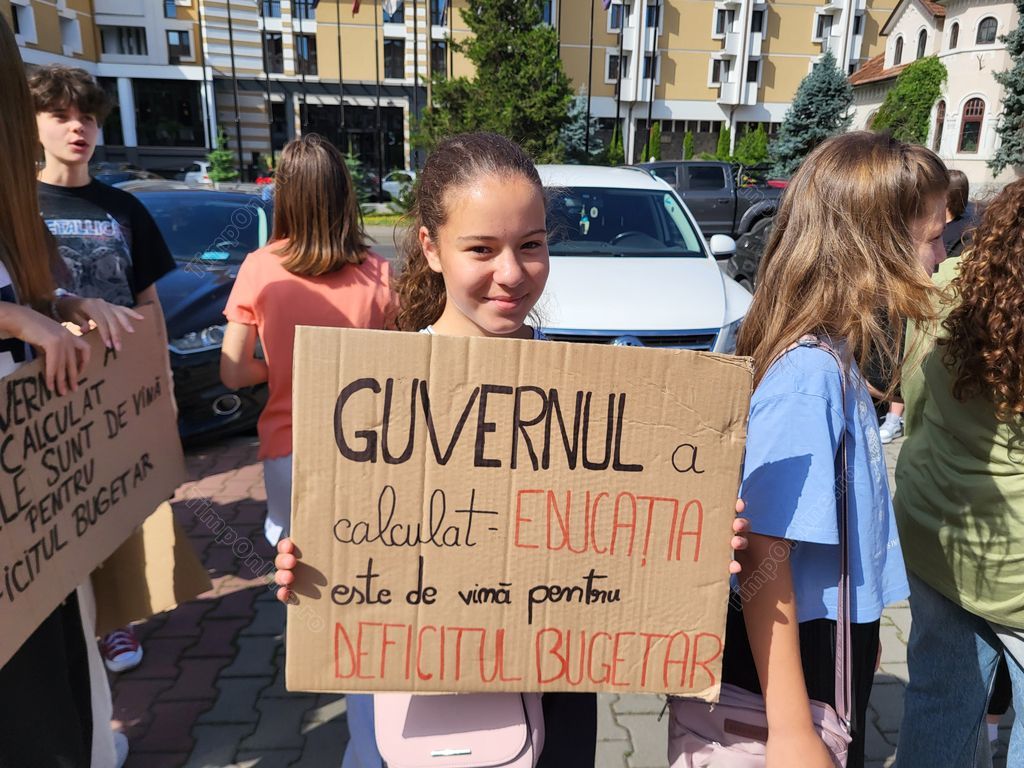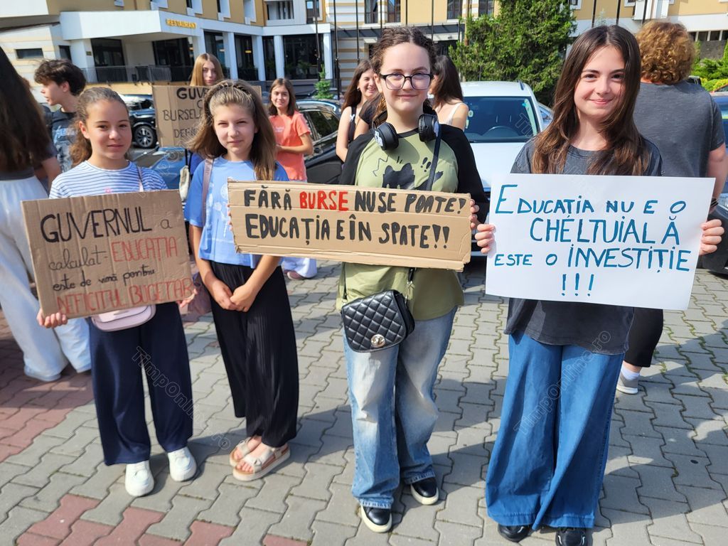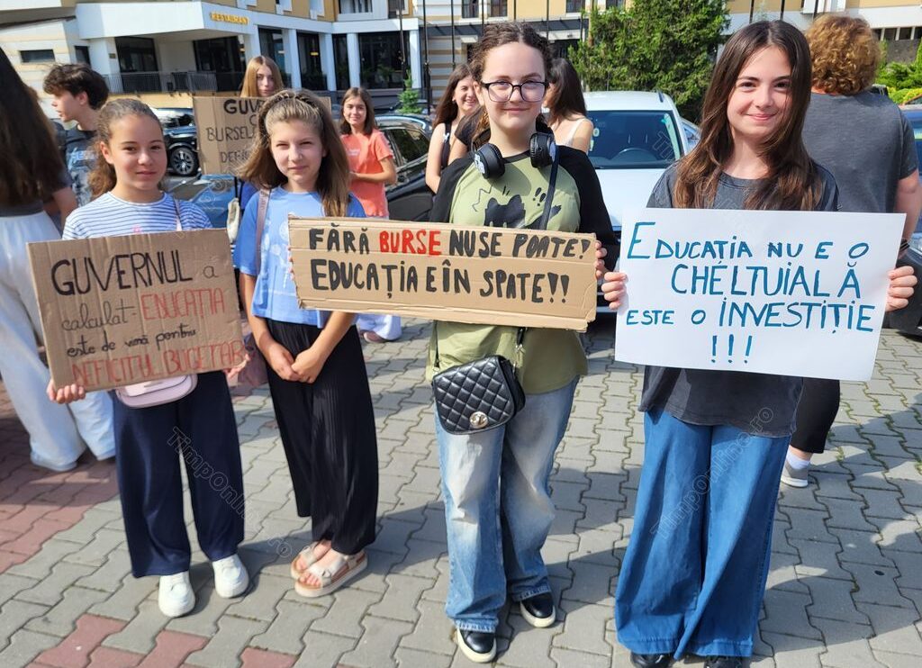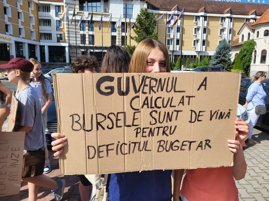 ”De ce, dece și bursele?”, ”Fără burse, fără carte, România merge în spate!”, ”Guvern de carton cu minciuni pe megafon!”, ”Ați promis transparență, ne tratați doar cu indiferență!”, ”Bursa noastră de hârtie ne aruncă în sărăcie!”, ”Burse tăiați, copiii sunt abandonați!”, au scandat elevii care au ieșit în stradă, în fața Palatului Administrativ.