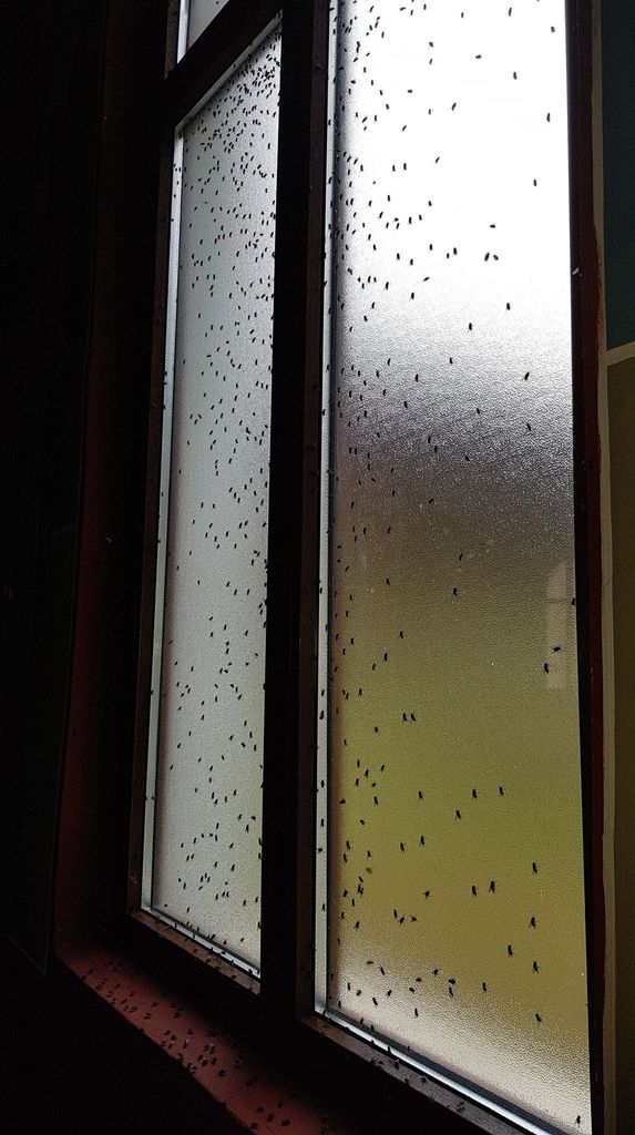 Imaginile, transmise Timp Online de unul dintre participanţi, aduc aminte de filmele de groază în care apar scene cu exorcizări. Sute de muşte zumzăie la ferestre, iar altele sunt moarte pe sub geamuri.