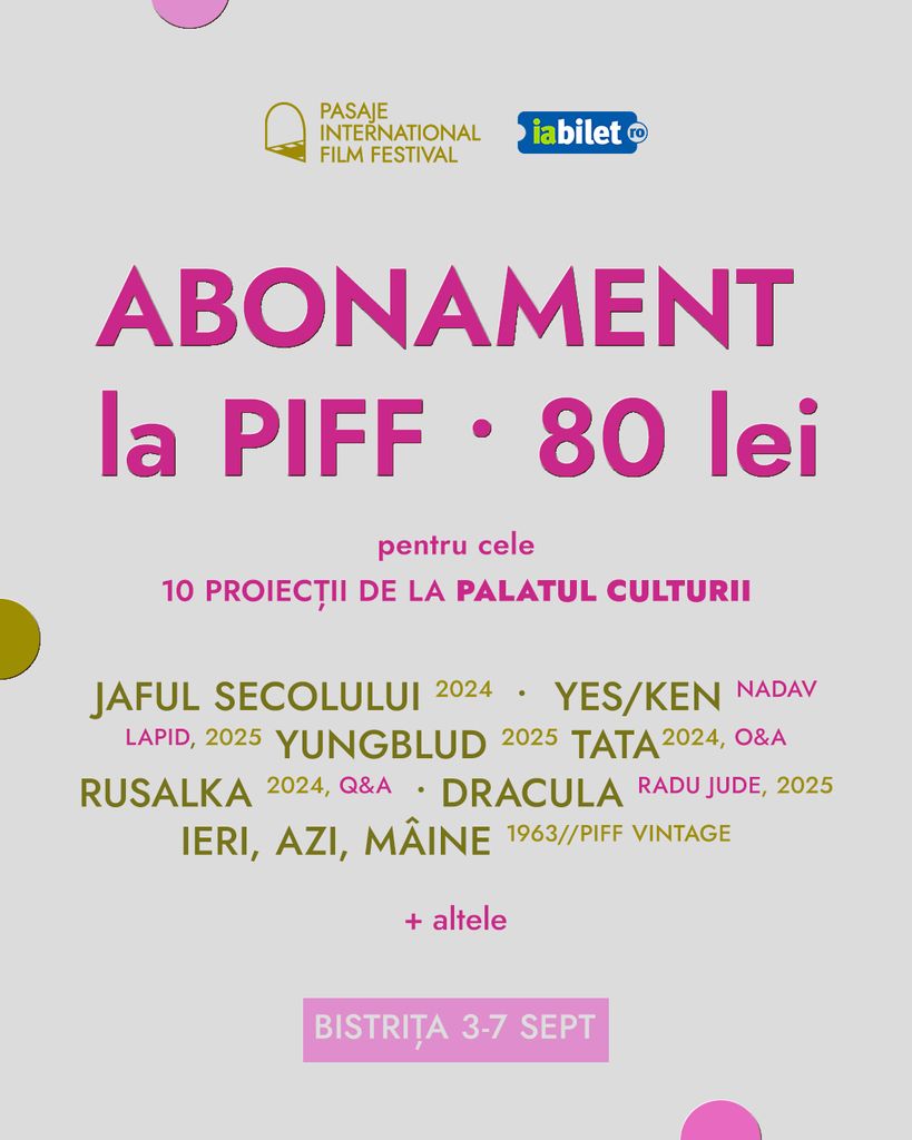 Ne bucurăm să vă oferim un număr limitat de ABONAMENTE pentru cele 10 proiecţii + secțiunea de scurt metraje de la PALATUL CULTURII din cadrul Festivalului de Film PASAJE, în perioada 3-7 septembrie!!