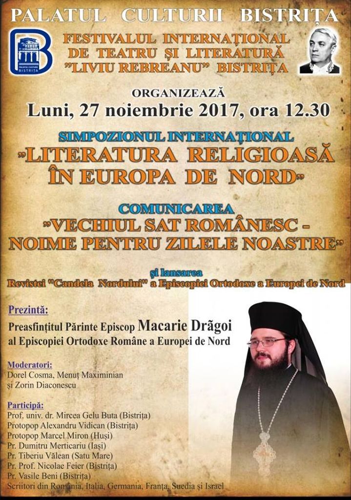 Luni 27 noiembrie, de la ora 12.30, la Palatul Culturii au loc simpozionul ”Literatura religioasă în Europa de Nord”, comunicarea ”Vechiul sat românesc – noime pentru zilele noastre” și lansarea revistei ”Candela Nordului” a Episcopiei Ortodoxe a Europei de Nord.