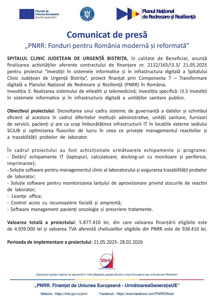 Finalizare proiect: ”Investiții în sistemele informatice și în infrastructura digitală a Spitalului Clinic Județean de Urgență Bistrița”
