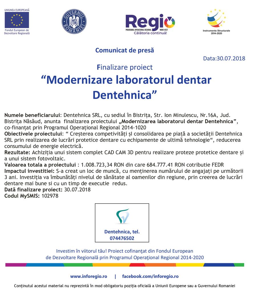 Dentehnica SRL Bistrița anunță finalizarea proiectului “Modernizare laboratorul dentar Dentehnica”, finanțat prin Programul Operațional Regional 2014-1020.