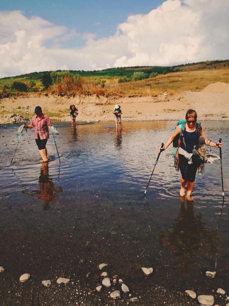 “Ziua a 5-a am plecat de la Dealu Negru înspre Petriș. Briza dimineții ne ușura cu mult mersul și reușeam tot mai mult să ne bucurăm sincer de frumusețea peisajului. Am ajuns în sat și am descoperit haiducia supremă: mere de tot felul de soiuri, pere dulci, struguri albi și negri aromați, nuci verzi, toate la o simpla înălțare pe vârfuri, la întinderea mâinilor, sau chiar la picioarele noastre. Ne-am oprit și la magazinul din sat, unde am savurat o înghețată la cornet, sincronizându-ne ritmul cu cel al uliței principale, cumva plictisit, dar foarte prudent, conștient de sine. Am părăsit Petrișul prin niște lanuri de porumb, am trecut de două ori prin apă, ultima oară am renunțat la încălțări și am fost toate de acord că apa rece este cel mai bun leac pentru picioarele obosite, captive în bocanci. În continuare, traseul a fost unul ușor, fără evenimente, doar cu mult soare și transpirație. Ajunse la destinație, am mai mers puțin din inerție și ne-am lovit una de alta ca niște piese de domino. În acel moment ne-a intrat drumul în sânge, categoric și ireversibil. Ne-am oprit în față la Lalaeaua Pestriță și am încheiat ziua cu numărul cinci.