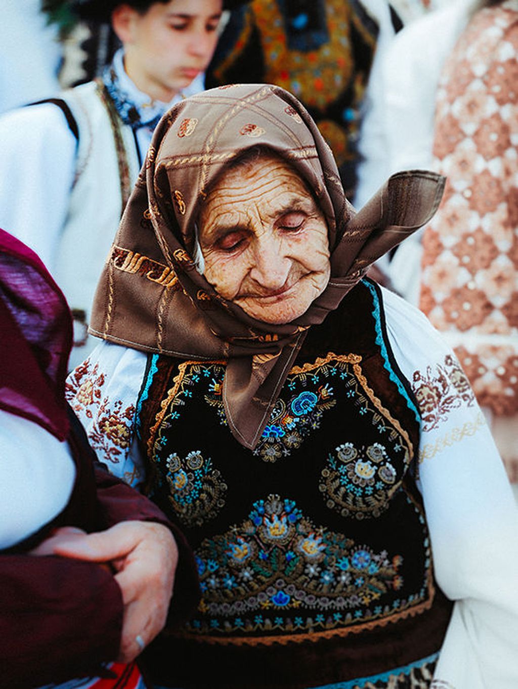 Ioana Iuga a surprins o bătrână îmbrăcată în costum popular care se ţine de braţul unei alte persoane şi are privirea aplecată în jos.