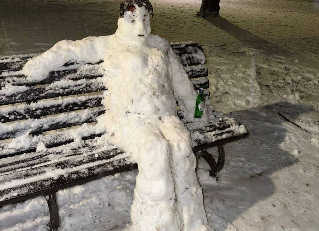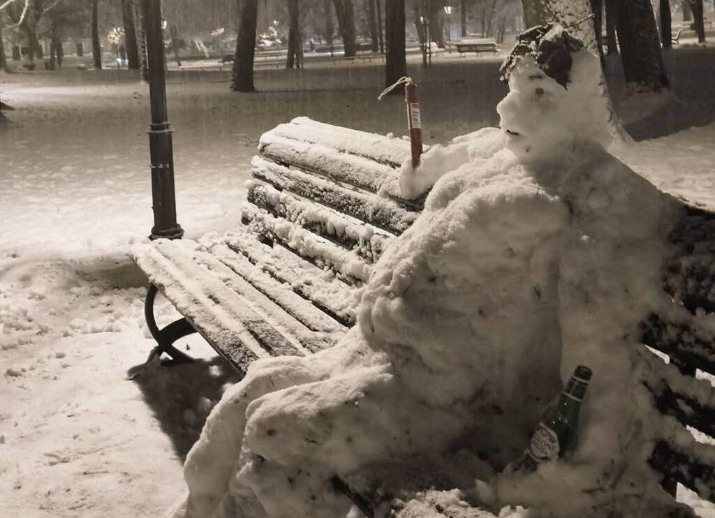 Zăpada abundentă care a căzut în ultima perioadă le-a stârnit unora imaginația. Așa a apărut un om de zăpadă care stă, relaxat, pe o bancă din parc. Imaginile au fost postate în mediul online.