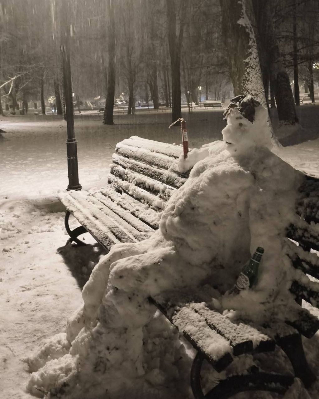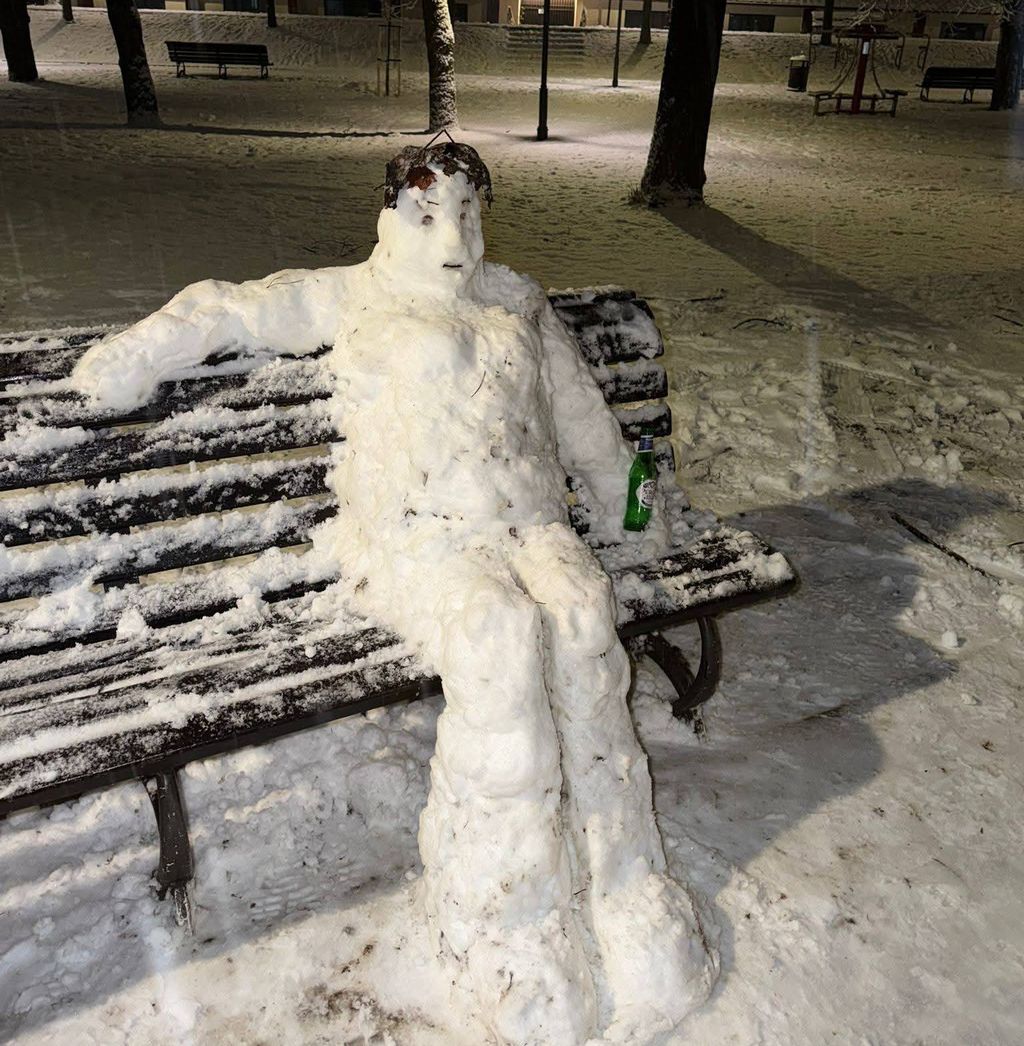 Zăpada abundentă care a căzut în ultima perioadă le-a stârnit unora imaginația. Așa a apărut un om de zăpadă care stă, relaxat, pe o bancă din parc. Imaginile au fost postate în mediul online.