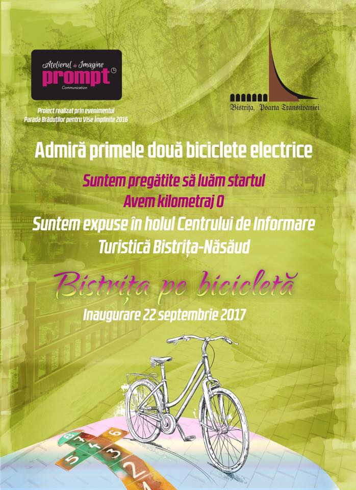 “Atelierul de Imagine Prompt Communication, în calitate de organizator al evenimentului Parada Brăduților pentru Vise Împlinite, își onorează a doua promisiune făcută la ultima ediție a acestui eveniment: demararea unui proiect din zona sănătății colective, dedicat întregii comunități bistrițene – Bistrița pe bicicletă. Demararea acestui proiect a constat în achiziționarea primelor două biciclete electrice de ultimă generație fabricate de brand-ul românesc Pegas, care au fost preluate de Primăria Municipiului Bistrița pentru utilizarea lor în folosul comunității”, a scris Gabriela Montoiu pe Facebook.